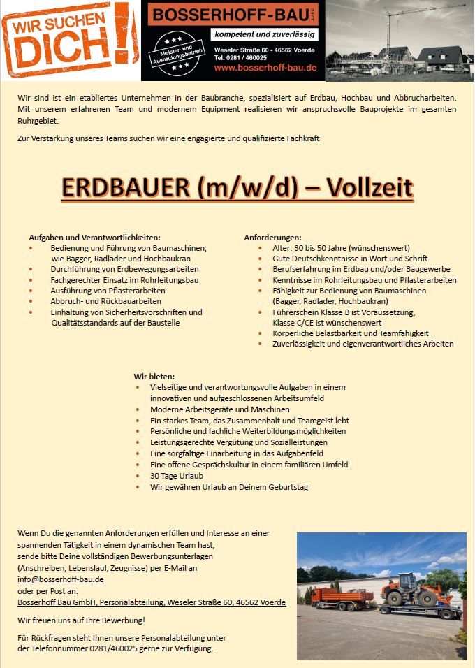 Berufserfahrung, die Fähigkeit zue Bedienung von Baumaschinen (Bagger, Radlader, Hochbaukran), ein Führerschein der Klasse B (mindestens) und fließende Deutschkenntnisse sind erforderlich.