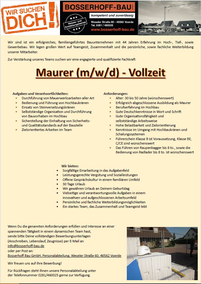 Wir suchen ab sofort und dauerhaft für unsere Baustellen in Voerde und nährerer Umgebung einen dynamischen