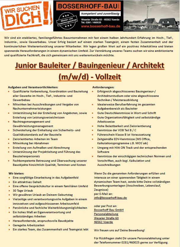 Junior Bauleiter / Bauingenieur / Architekt (m/w/d) - Vollzeit